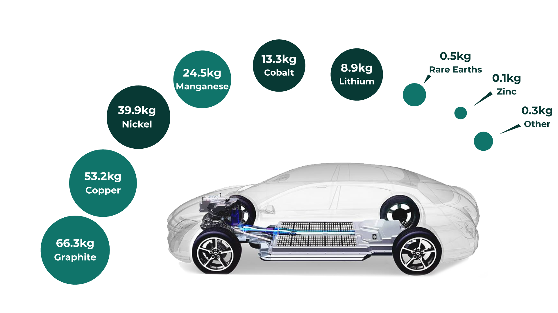 Electric Vehicles (EVs) require a wider range of minerals for their motors and batteries compared to traditional Internal Combustion Engines (“ICE”). In fact, an EV is expected to have 6 times more minerals than an ICE car and on average weighs 340 kg more as a result.